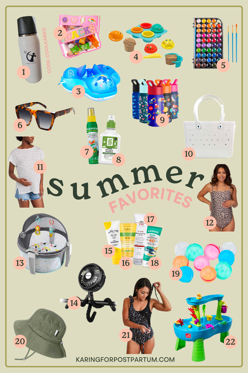 1. Ceres Chill Milk Cooler Thermos (CODE: COOLKARRIE) | 2. Snack & Stuff Pouches (For sunscreen & snacks!) | 3. Laycol Baby Swim Float with Sunshade | 4. Sand Cupcake Maker | 5. Watercolors ( To paint rocks or seashells!) | 6. Sojos Square Sunnies For Mom | 7. Badger Bug Spray | 8. Hello Bello Bug Spray | 9. Simple Modern Kids’ Water Bottle | 10. Simply Souther Bogg Bag Dupe | 11. Cutoff Denim Maternity Shorts (cutoffs that actually work with a bump!) | 12. PinkBlush Maternity Leopard Swimsuit | 13. On the Go Shaded Fischer Price Play Space | 14. Stroller Fan | 15. Tubby Todd Sunscreen Cream | 16. Babo Botanicals Sunscreen Cream | 17. Elta MD Sunscreen for Mom | 18. Badger Sunscreen | 19. Reusable Water Balloons (perfect for toddlers and olders!) | 20. Jan + Jul Adjustable Sunhat | 21. Movemama Breastfeeding Friendly Tie Swimsuit | 22. Water Table